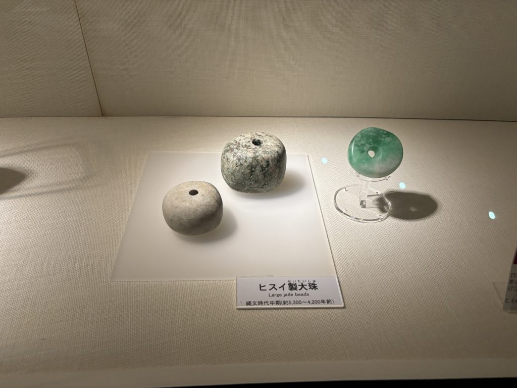 写真の最後から2番目のヒスイ製大珠には、正確にきれいな丸い穴が開いている。基本石に穴をあけるには、その石より硬い石の粉を使うらしい。ヒスイはかなり硬い石で、それ以上の硬い石の入手は無理だった模様。「古代日本の超技術」ではその方法について仮説を元に再現を試みているが、実際のところはこれからの調査によるとのこと。