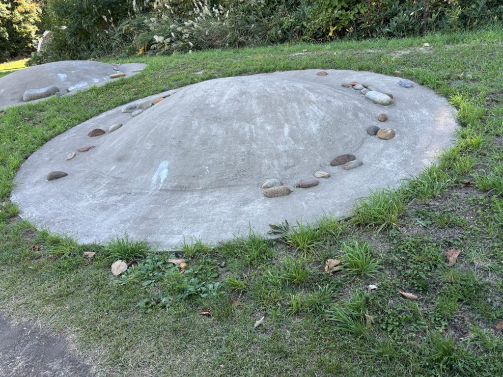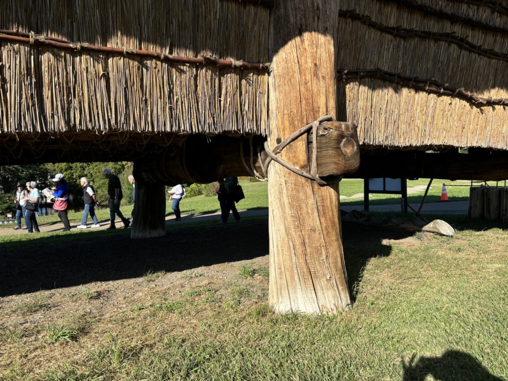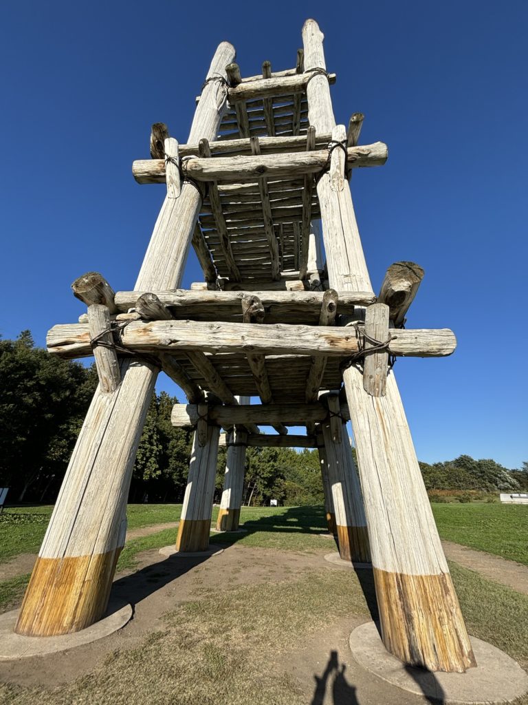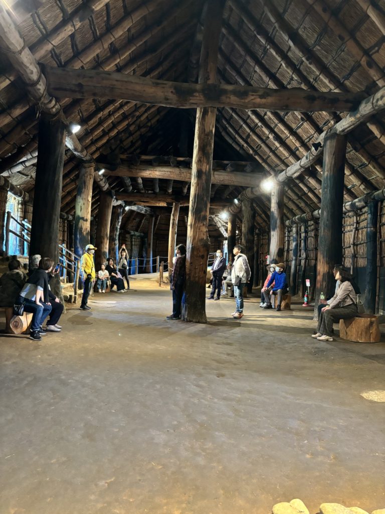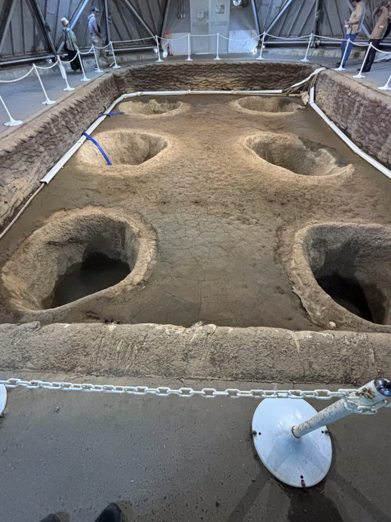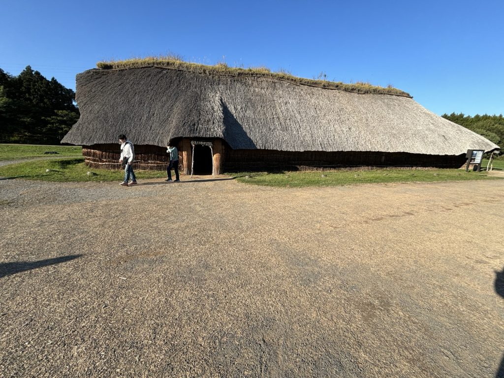 その他、いろいろな”すごい”はあるのだが、竪穴建物もすごい。普通の住居は3匹の子ブタの藁の家的な外観だが、地面を深く掘ることで中に入ると天井は思ったより高い。当時は当主の寿命が30歳くらいで、3世代同居はなく4人家族が主流だったので、このスケールでもなんとか暮らせたのだろう。外側が何かが分かるものは今の段階では見つかっていないか、断熱性を考えると土壁が有力だとガイドさんは言っていた。