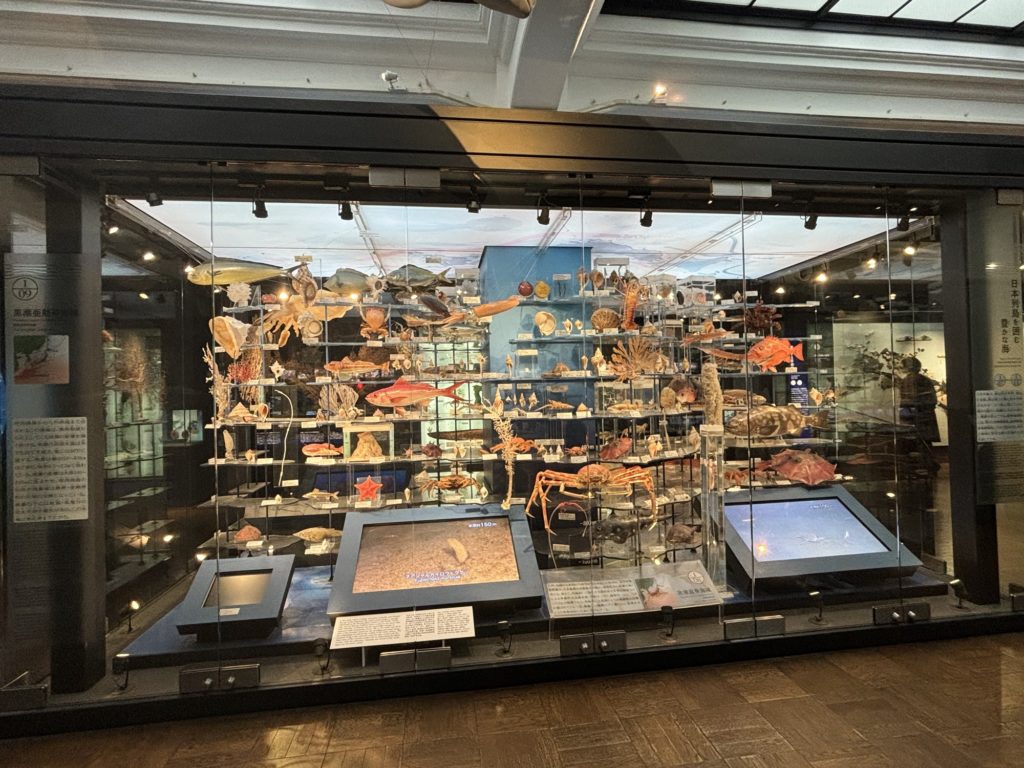 イヤホンガイドを聞くと、研究者が見せたいポイントが分り、感動ひとしお。↓は、日本の周りの海の生き物を、住んでいる場所の深さで分けて展示したもの。こちらが太平洋側で、反対側に日本海の生物が展示されていた(と記憶している)。