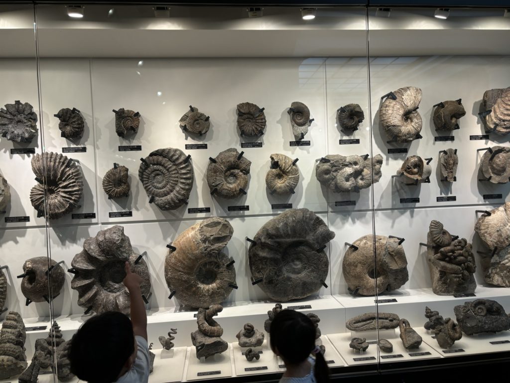 ↓北海道で採取されたアンモナイト。北海道は埋もれている地層の関係で保存状態のよいものが多く発見されているそう。採取されても、こういう風にきれいに取り出されるまでには手間がかかるので、手つかずの標本がたくさんバックヤードにあるらしい。
