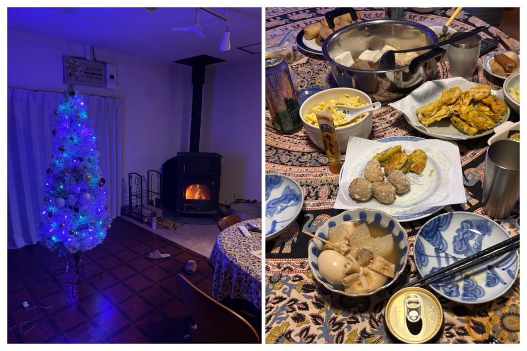 12月:小中学校の同級生3人おでんパーティーを兼ねた忘年会。メンバーの一人が自宅で栽培した大根を提供してくれる。薪ストーブとクリスマスツリーがレストランパーティー風。