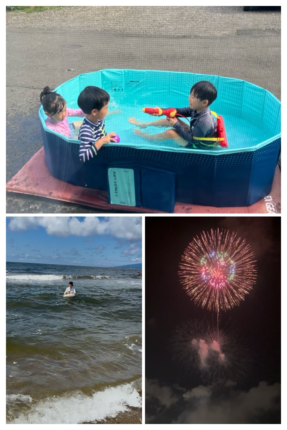 8月:お盆前から長女と孫①②が秋田に遊びにくる。国花苑、近場の海、雄物川の花火大会など夏を楽しむ。13日からは実家の雫石へ移動して、大型ビニールプール、手持ち花火、バーベキューなど、田舎ならではの広い庭を活用して楽しむ。例年通り地区の盆踊りで、持ちきれないほどの景品もゲット